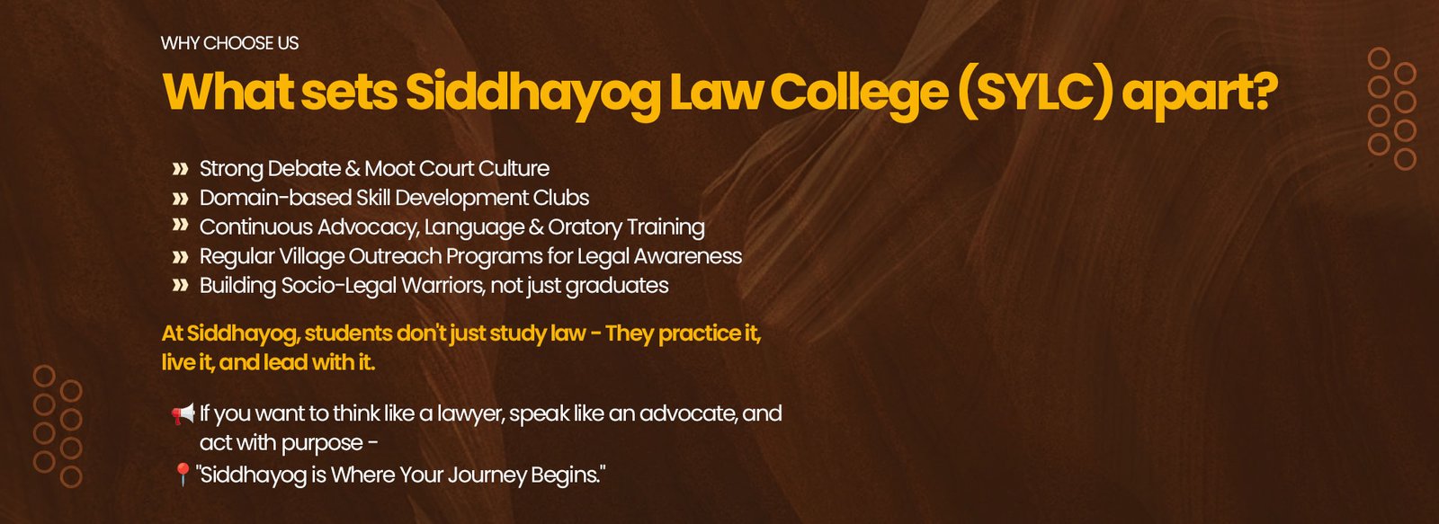 Started in the year 2017 at Khed, Ratnagiri, Siddhayog Law College is all set to be one of the best law colleges of the town. Situated near the bank of Naringi River at the foothills of green mountains, it has a separate hostel facility for female and male students.